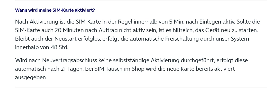 Vertrags-SIM Karten werden nach 21 Tagen automatisch aktiviert.