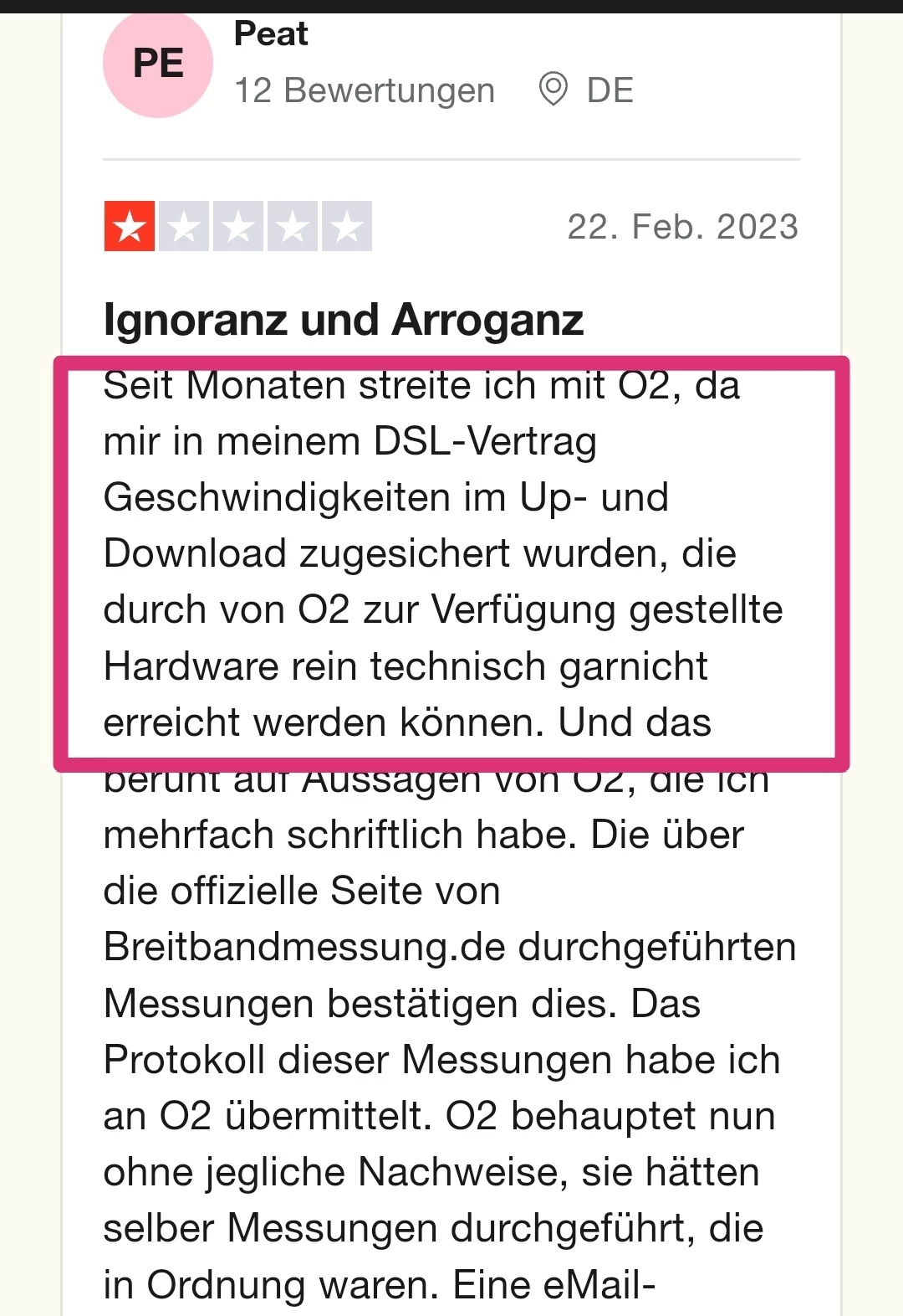 Die Kundenbetreuung hat mir in 2022 mehrfach mitgeteilt, dass die bis 04.01.2023 zur Verfügung gestellte Leitung nicht in der Lage war, die vertraglich zugesicherte Downloadgeschwindigkeit zu erreichen. Wie soll man das nennen, wenn nicht einen vorsätzlich begangenen Vertragsbruch? Ich habe die mangelhafte Geschwindigkeit nachgewiesen, die Messprotokolle liegen O2 vor. O2 behauptet, selber Messungen durchgeführt zu haben, bei denen die Ergebnisse in Ordnung gewesen sein sollen, legt aber keine Nachweise vor. Wie denn auch, wenn die Hardware die erforderliche Datengeschwindigkeit gar nicht leisten kann? Erst seit 04.01.2023 wurde mein Anschluss angeblich auf eine schnellere Leitung umgelegt.