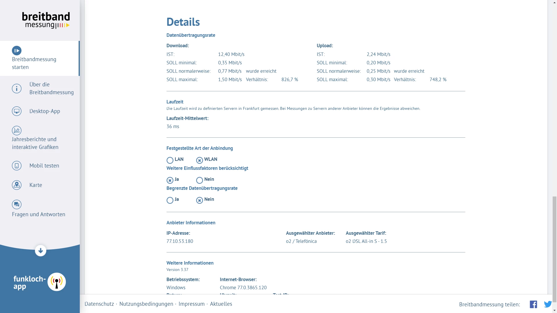 Im Screen der Breitbandmessung hat der TE einen “All-In S-1,5” als ausgewählten Tarif angegeben und kommt somit im DL auf ein Verhältnis von 826,7%(?).