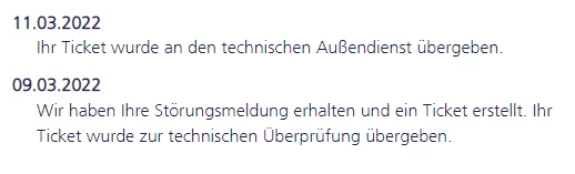 Aber an der Hotline wurde nur gesagt, dass “ein Ticket eingereicht wird” und sonst nichts. Zwei tage später rief der Technische Außendienst an, der in der Folgewoche nur eine SMS geschickt hat: In spätestens zwei Tagen ist das Problem behoben. Das war vor 17 Tagen.