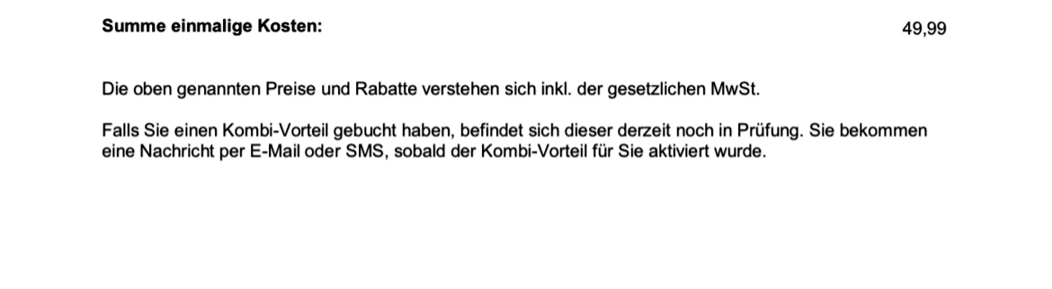 Falls Sie einen Kombi-Vorteil gebucht haben, befindet sich dieser derzeit noch in Prüfung. Sie bekommen eine Nachricht per E-Mail oder SMS, sobald der Kombi-Vorteil für Sie aktiviert wurde.