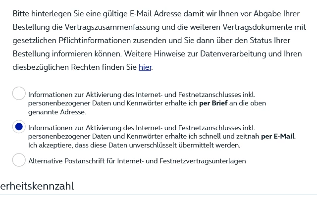 Der Kunde kann aber doch im Bestellprozess (grad getestet) die Auswahl “per Mail” (inkl. personenbezogener Daten und Kennwörter) treffen, dort kommt der explizite Hinweis “Ich akzeptiere, dass diese Daten unverschlüsselt übermittelt werden.”