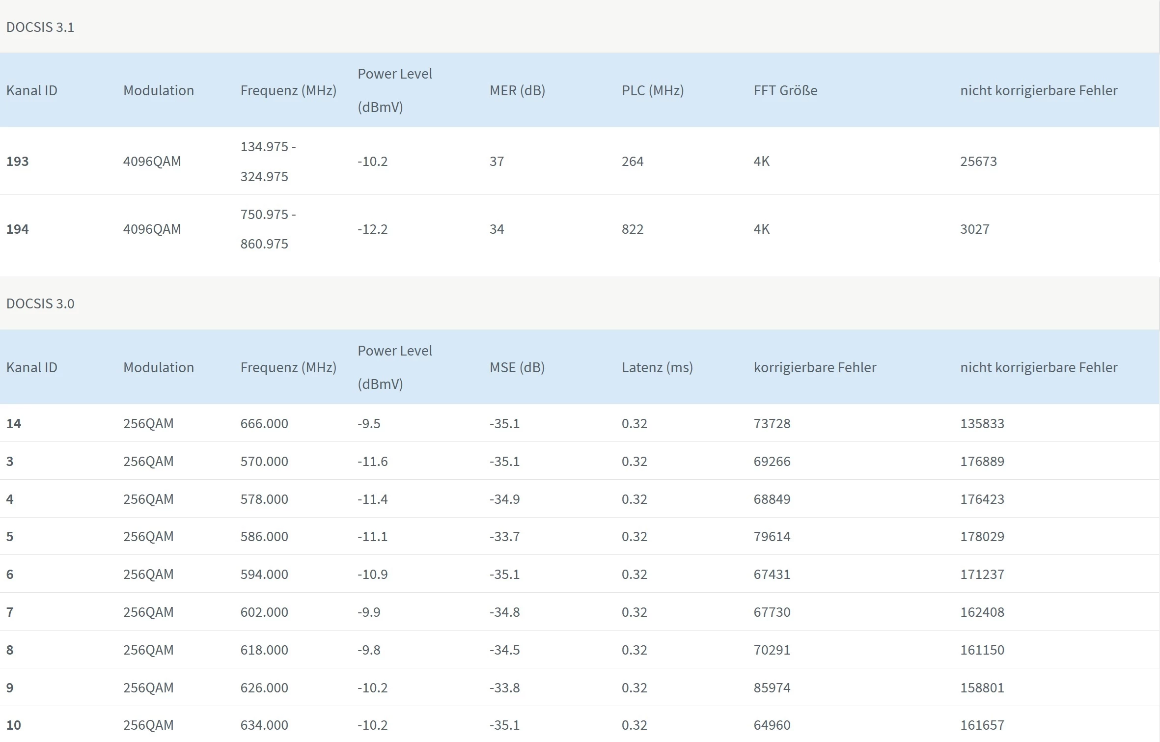 hmm auf DOCSIS 3.0 scheinen dir die ganzen Kanäle zu entgehen. Die vielen “nicht korrigierbaren Fehler” deuten auf eine Störung hin. Am besten einmal eine Störung melden wie du schon ansprichst, am besten mit dem Hinweis, dass du nach Analyse nur 3 Downstream und 4 Upstream Kanäle hast sowie, dass auf DOCSIS 3.0 die MSE Werte alle bei ca. -34 liegen inklusive Fehler.