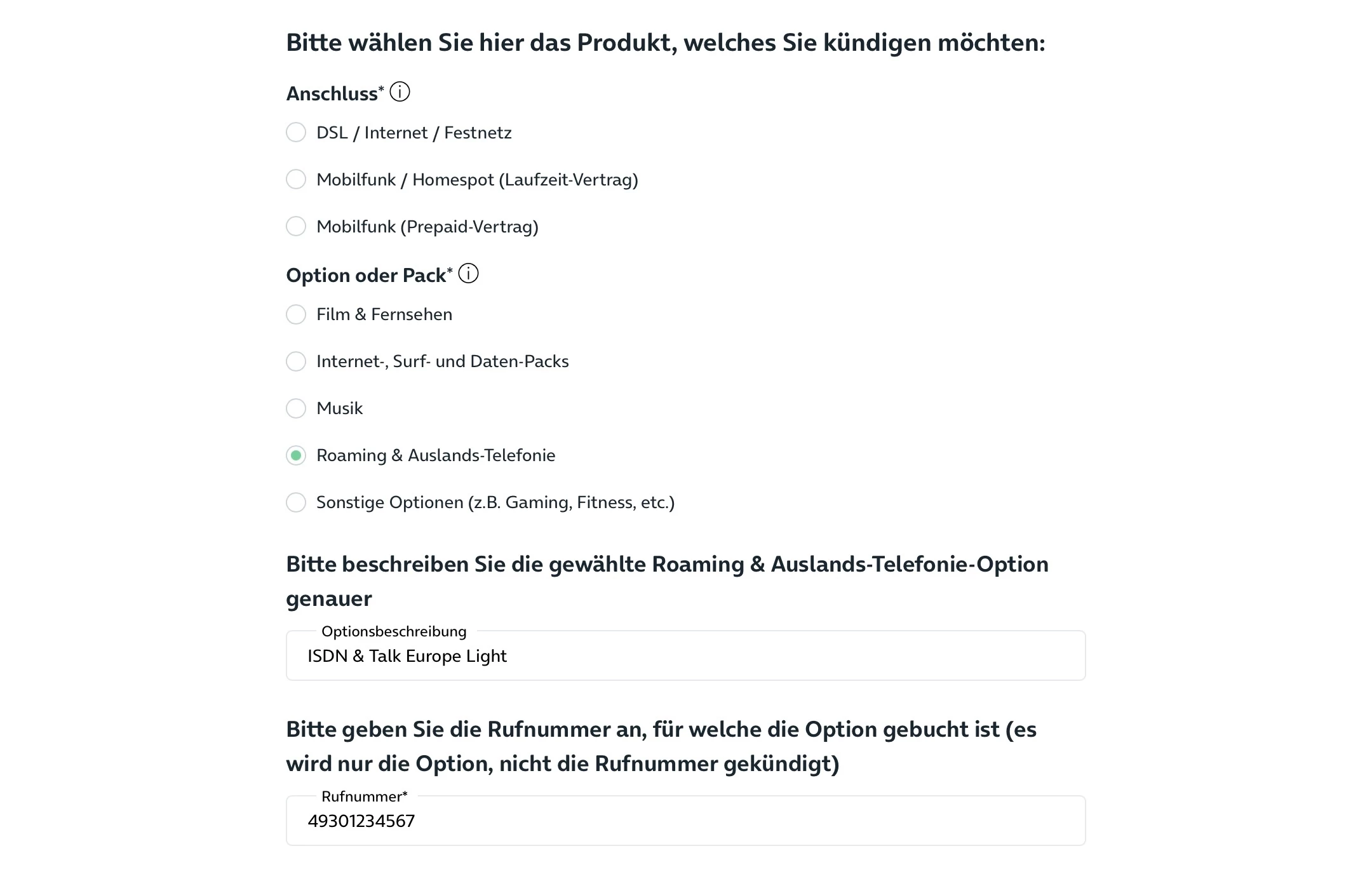 entgegen gegenteiliger Behauptungen in diversen Service-FAQs scheint es keine Möglichkeit zu geben, Optionen online zu kündigen – weder via Web oder App. Sofern man nicht auf eine nichtexistente URL verwiesen wird, bekommt man bestenfalls angezeigt, welche Optionen man gebucht hat – aber keinerlei Option, diese zu kündigen!