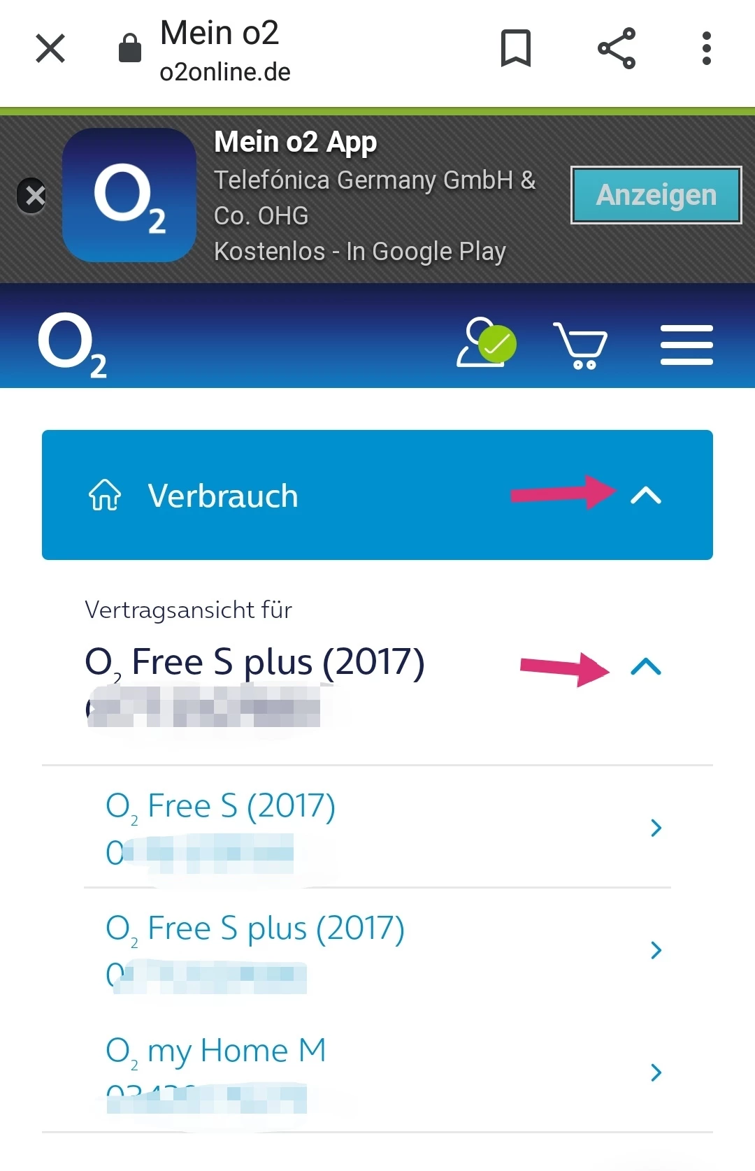 Einloggen >> Klick auf "Verbrauch", dann Klick auf "Vertragsansicht für..." und dann siehst du alle hinterlegten Verträge (mobile Ansicht).