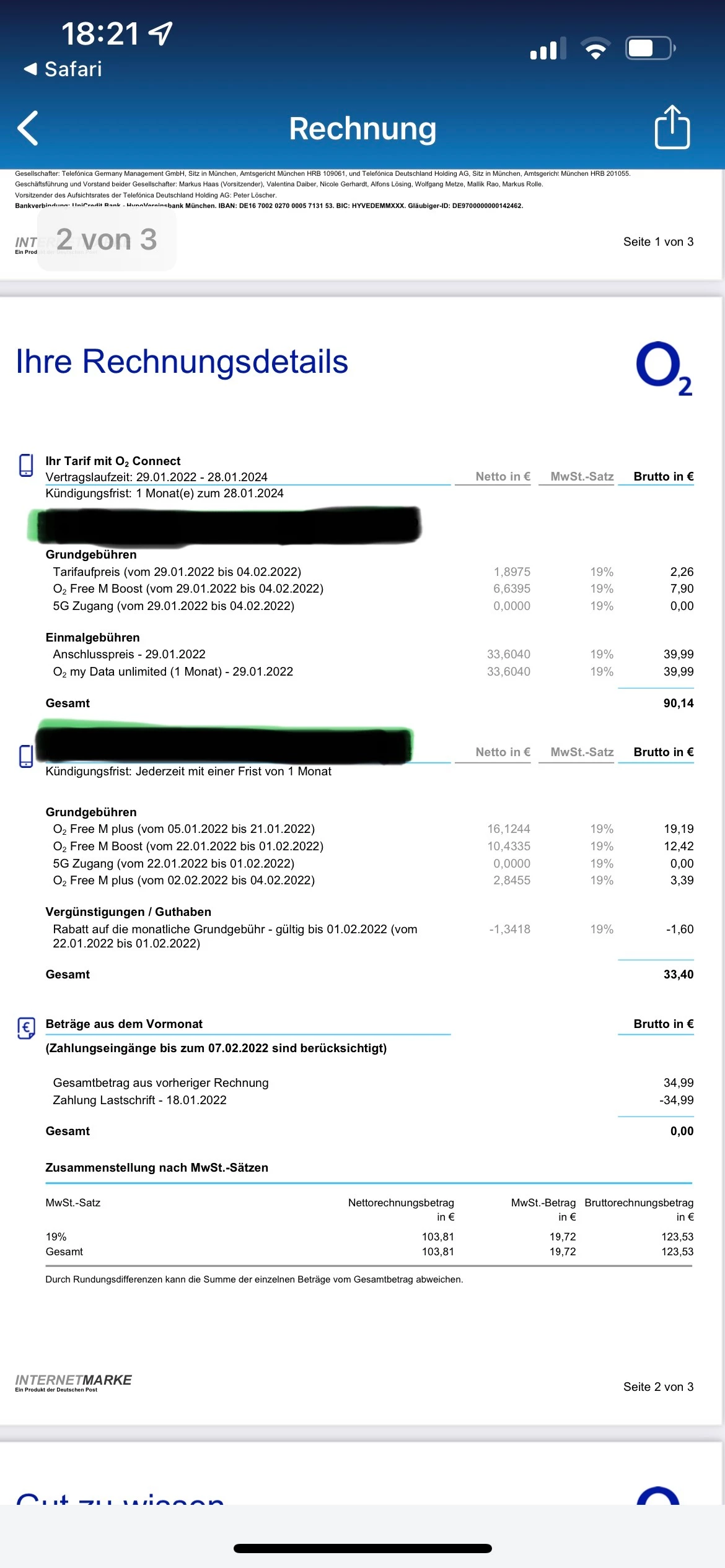 die 79,98€ sind nur für den neuen Vertrag (normalerweise 44,99€, hieß es vor Ort bei o2). Dann gibt es noch die andere Rechnung für den anderen Vertrag von 33,40 € obwohl ich rechtzeitig Widerrufen habe. Denkst du ich kann vor Ort mir die Rechnung erklären lassen oder kann hier jemand von o2 auch behilflich sein?