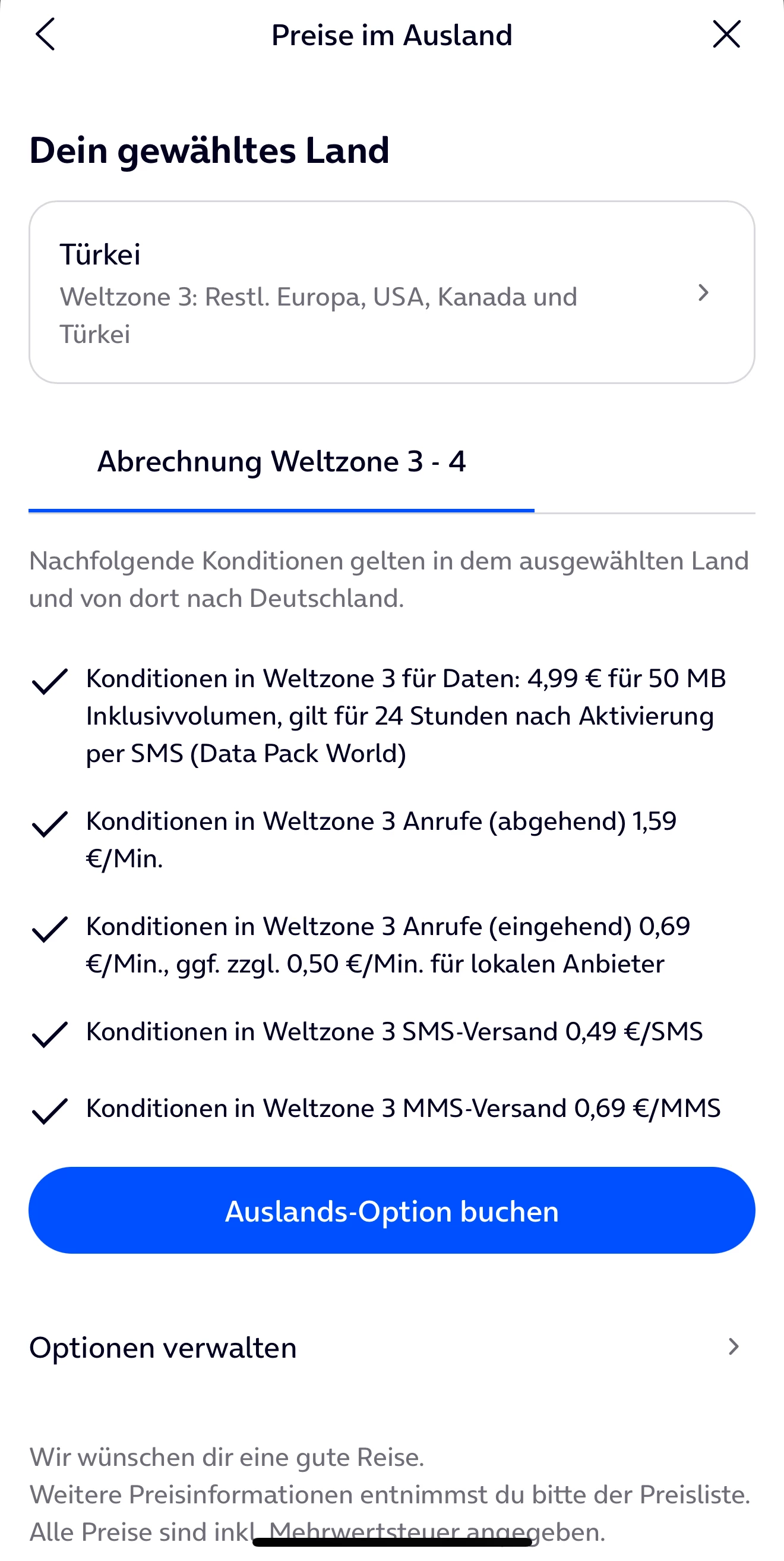 Hier kostet ein Anruf nach Deutschland 1,49 EUR pro Minute, ein ankommendes Gespräch kostet 0,69 EUR pro Minute.