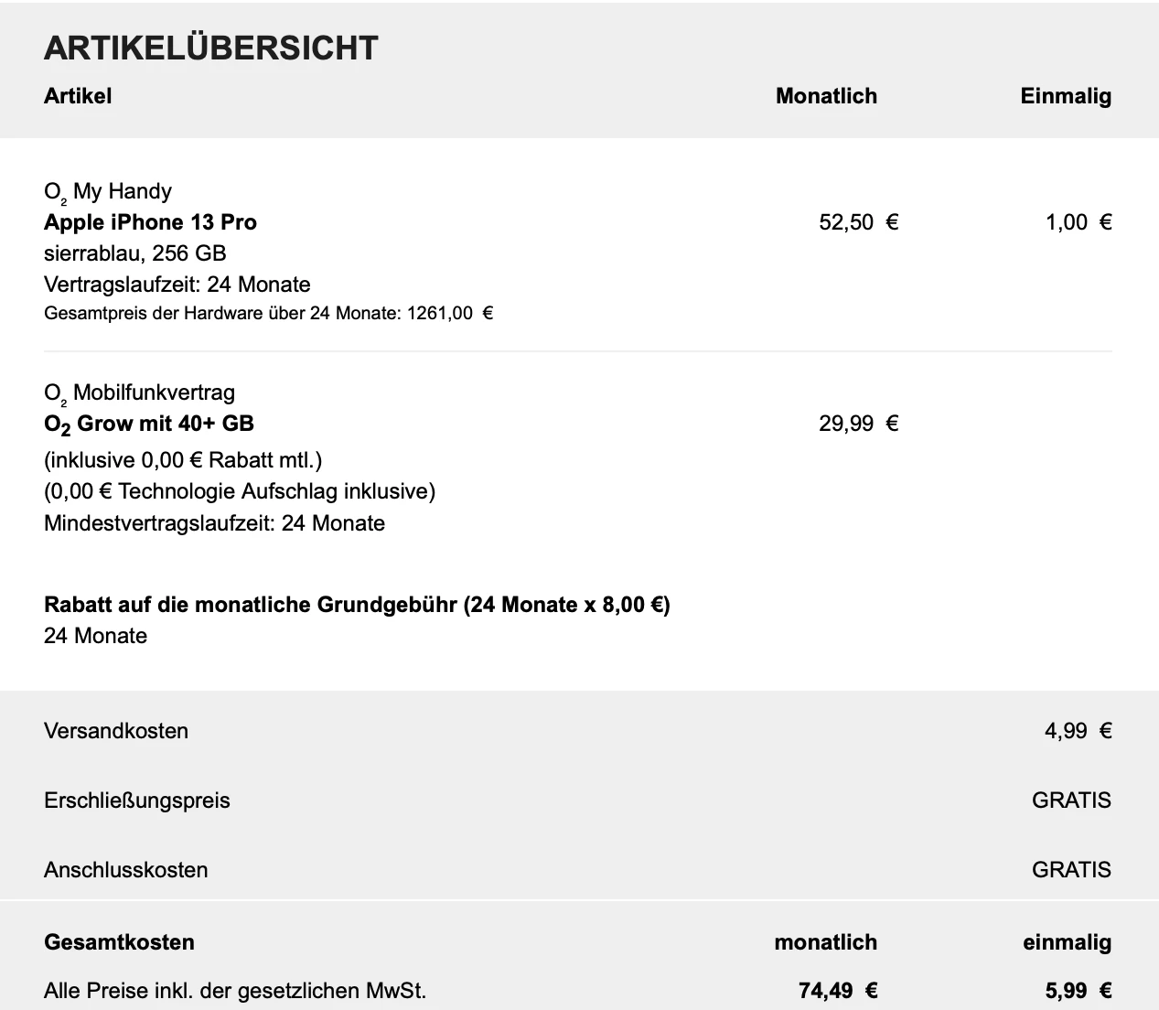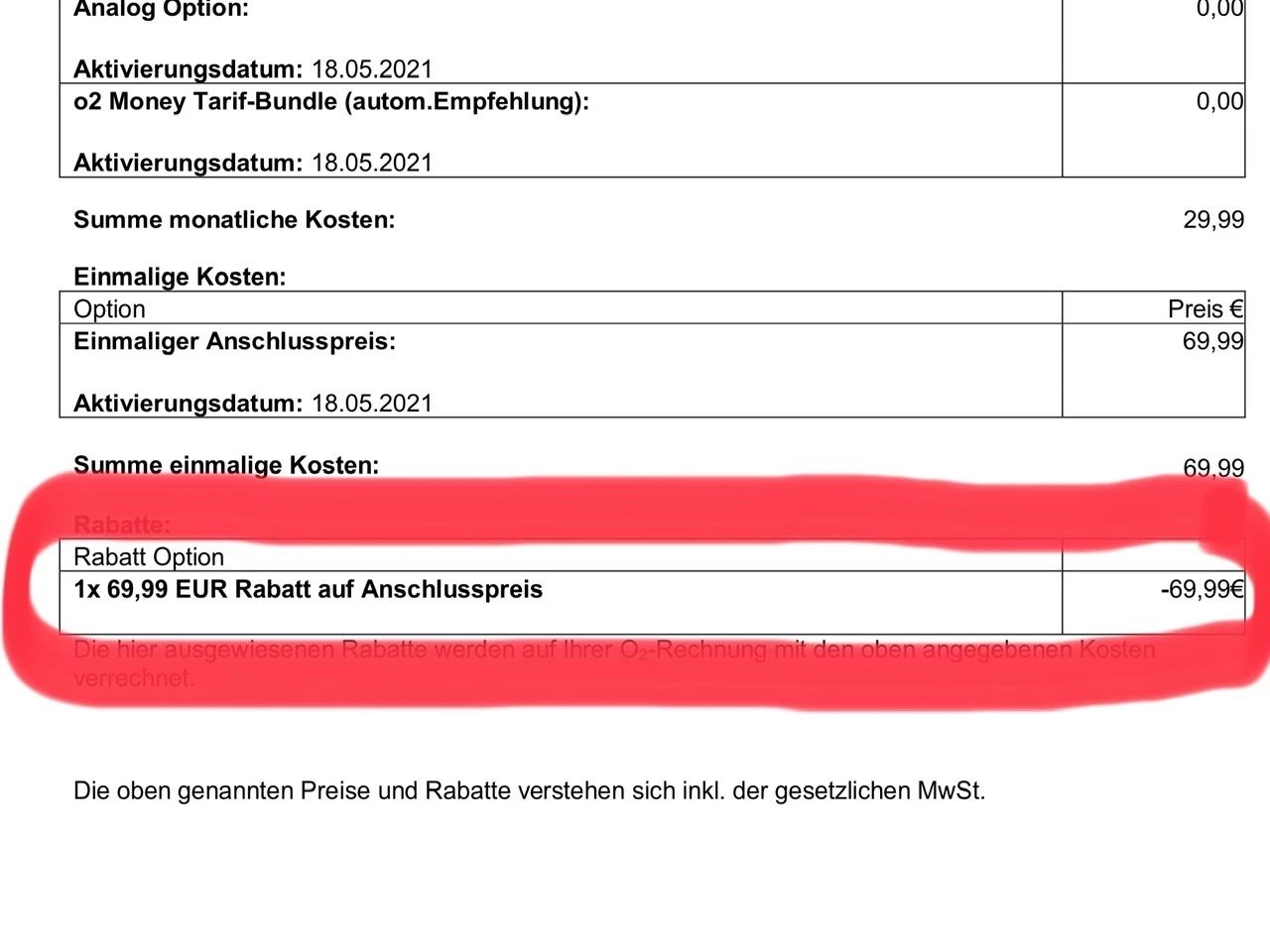 ich habe auf der Erstrechnung vom O2 my Home M, mit eigener FB, (ist hoffentlich bei Mobilfunkfragen richtig?) einen Anschlusspreis 69,99€ berechnet bekommen, obwohl der bei der Bestellung eigentlich wegfallen sollte. Kombivorteil ist abgezogen.