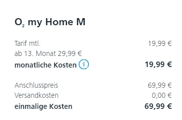 “Sichern Sie sich z. B. O2 My Home M und sparen Sie dabei ganze 69,99 € Anschlusskosten” steht jedenfalls im Angebot in der Kontonachricht.