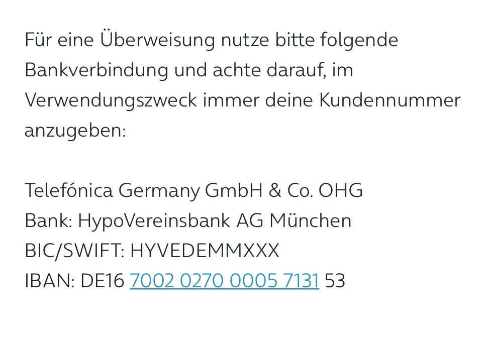 Also als verwendungszweck meine KundenNr und wie ist die IBAN von o2