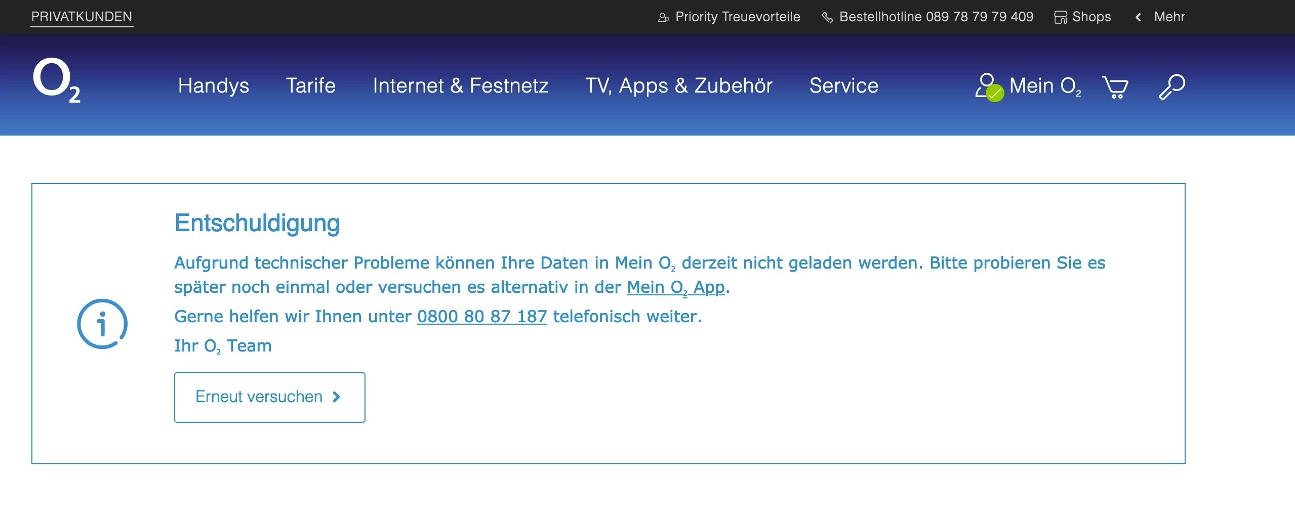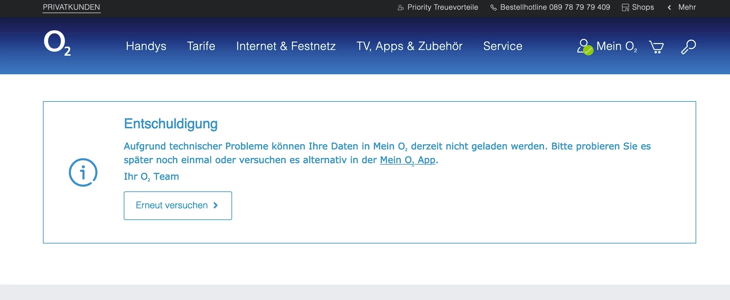 Heute erhielt ich die Nachricht, dass die aktuelle Rechnung in meinem persönlichen Servicebereich Mein o2 für mich bereitläge. Der Zugriff darauf funktioniert noch immer nicht: