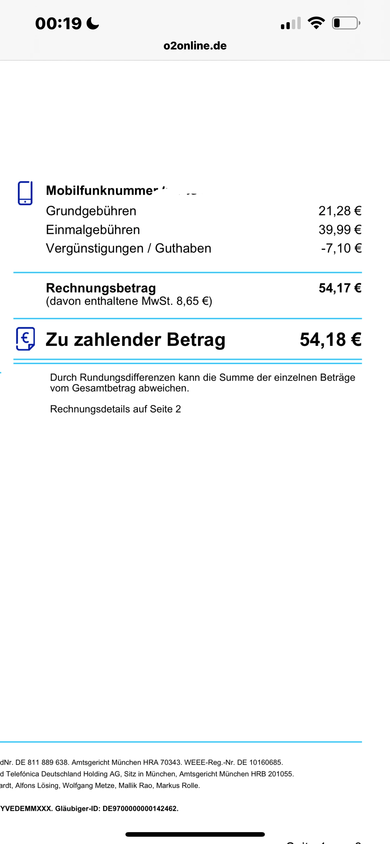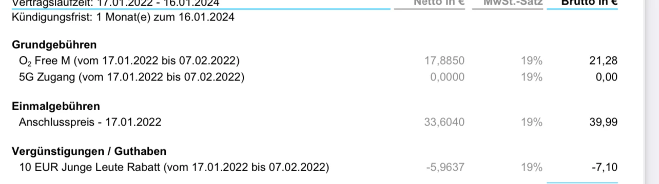 Guten Tag. Heute kam meine Rechnung an. Das Problem besteht darin, dass es hierbei um das Paket o2 Free M mit 20 GB handelt. Und die Einmalgebühren sollten eigentlich 0€ betragen (habe auch gerade eben auf der Website nachgeschaut). Screenshot 1. Und nun ergibt sich bei mir die Frage woher es kommt. Beim Screenshot 2+3 kann man sehen warum ich etwas irritiert bin.