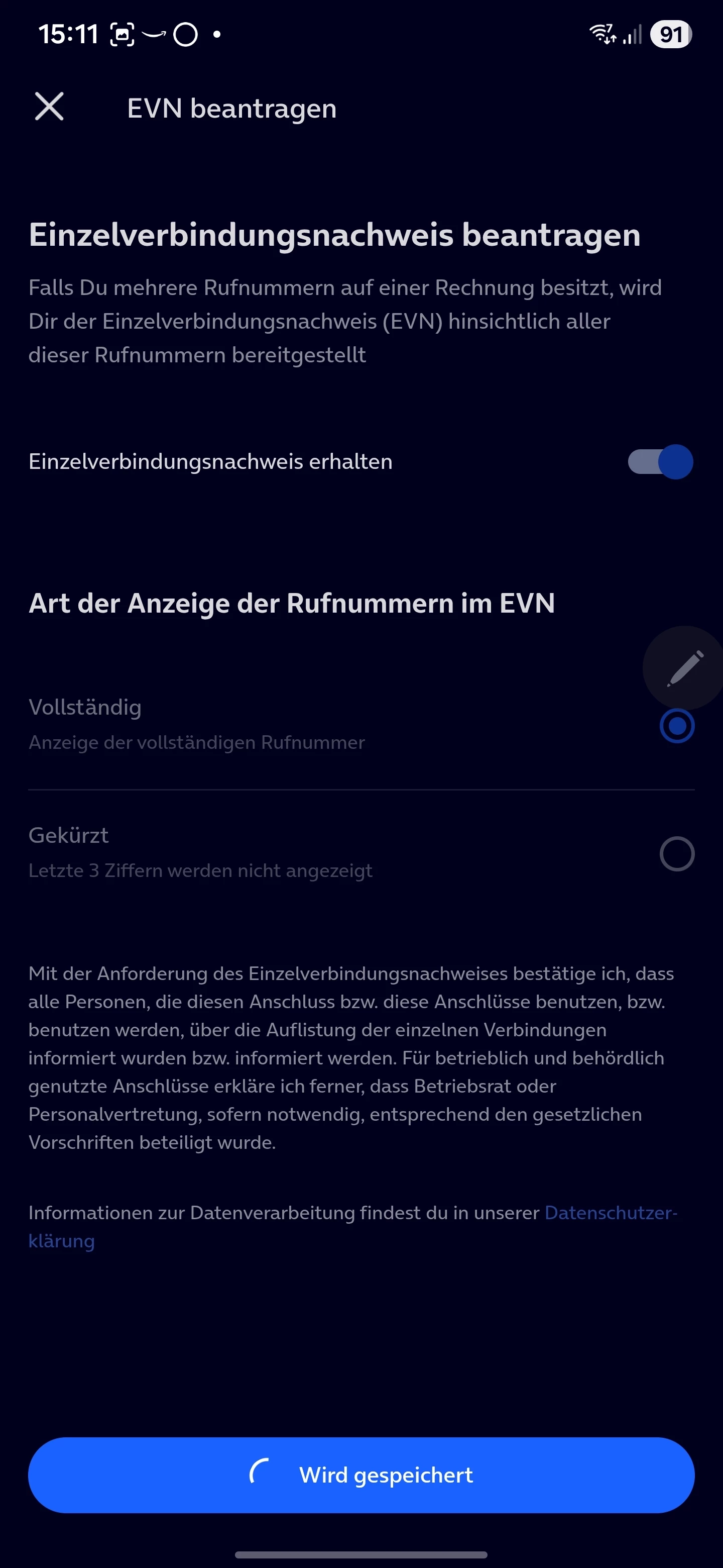 Was passiert, wenn du einmal  auf ‘ändern’ gehst und den Einzelverbindungsnachweis an und ausschaltest ?