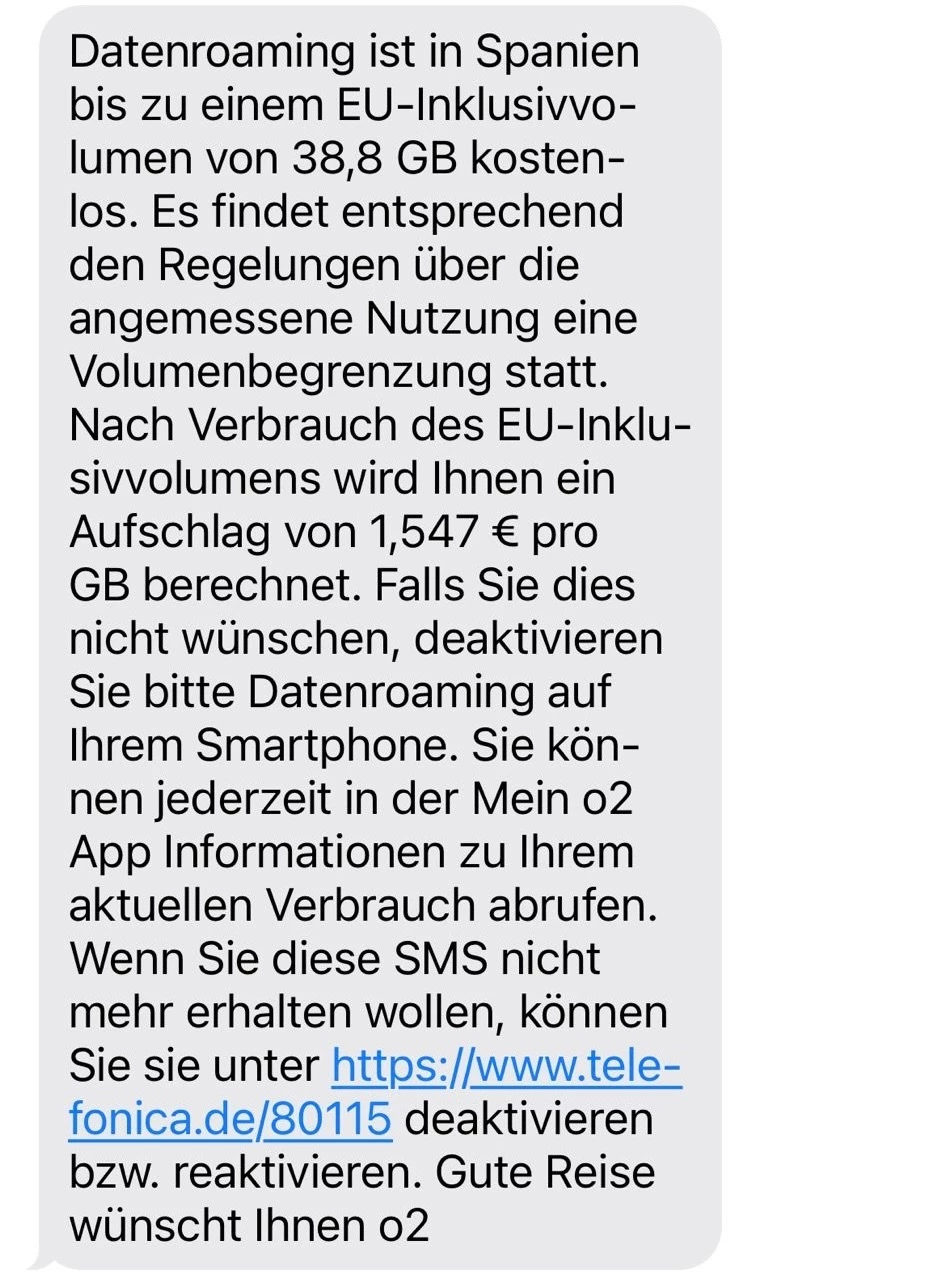 Wir waren kürzlich im Urlaub, genauer gesagt, auf Mallorca. Bei der Ankunft erhielt meine Tochter eine System-SMS von o2, in welcher folgendes mitgeteilt wurde: