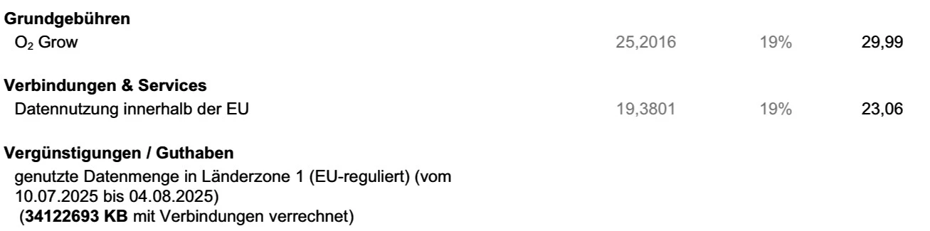 laut Rechnung sieht es so aus, als wenn die inkludierten 38,8 GB EU-Datenvolumen aufgebraucht waren und danach (zusätzlich) noch 34 GB verbraucht wurden.