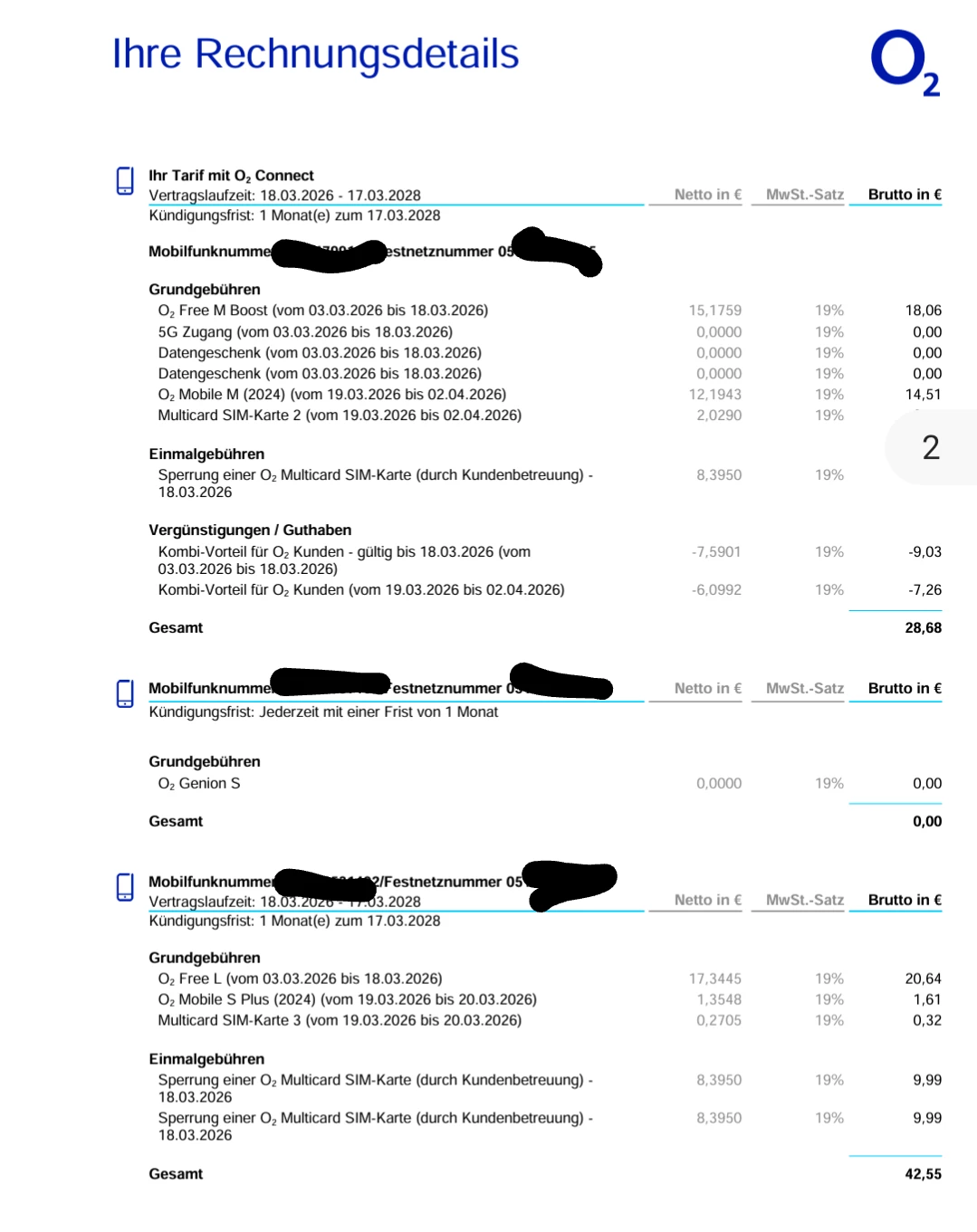 Dann spuken laut deiner Rechnung, noch jeweils eine zusätzliche Multicard pro Vertrag kaufmännisch in deinem Kundenkonto rum. Warte hier auf einen o2 Mitarbeiter, dass lässt sich alles klären und beheben. 😉