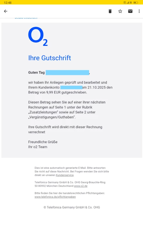 Am 21.10.25 erfolgte laut Mail die Gutschrift mit dem eindeutigen Hinweis