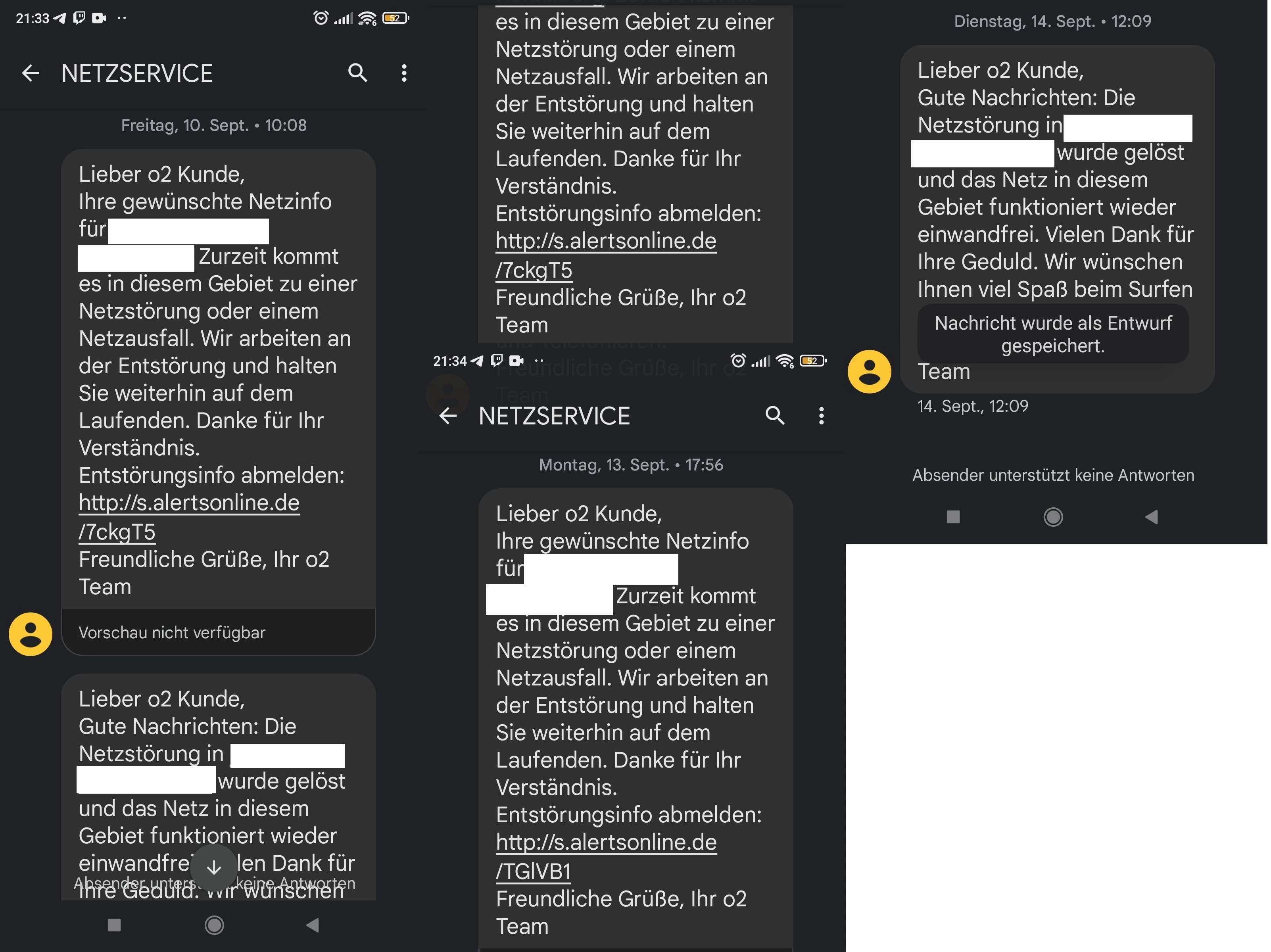 Die Störung lag wohl schon am 10. September vor. Daraufhin hatten meine Frau (0171 xx) und ich (0151 xx) eine Entstörungsinfo bekommen.