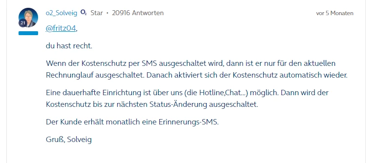 Ende März kam dann eine SMS von dir mit “Kostenschutz ein” und der Kostenschutz wurde so wieder aktiviert.