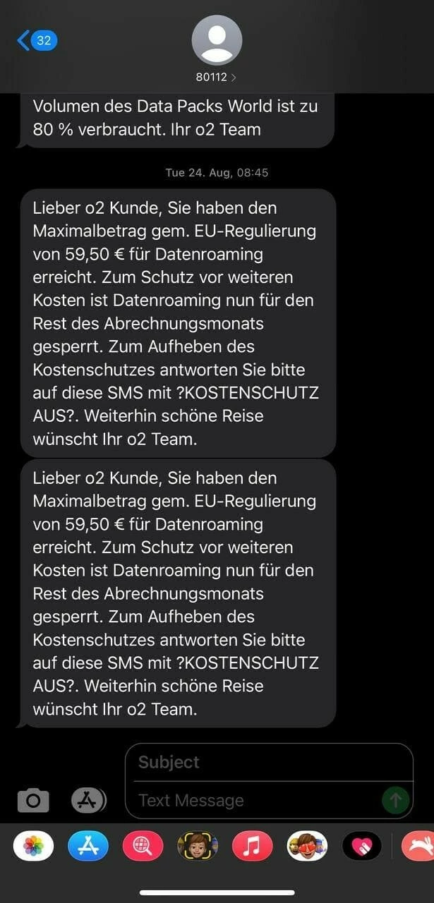 4. Wenn ich eine SMS mit Kostenschutz aus an o2 gesendet hätte, warum sollte ich dann am Abend wieder eine SMS erhalten, dass ich wohl eine erneute Datenroaming Sperre habe. Das macht gar keinen Sinn, wenn ich den Kostenschutz deaktivieren würde und o2 mir dann wieder sagt, dass ich maximal 59,50€ Datenroaming nutzen kann.