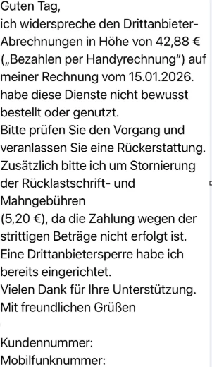 Ich widerspreche den Drittanbieter-Abrechnungen (Bezahlen per Handyrechnung) in Höhe von 42,88 € auf meiner aktuellen Rechnung. Ich habe diese Leistungen nicht bewusst bestellt.