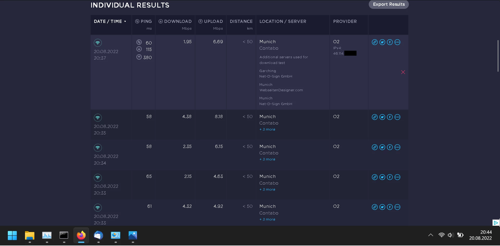 Über den Tag um die ~ 60 Mbit/s und Nacht ~ 110 Mbit/s hochladen und ~ 12 Mbit/s runterladen.