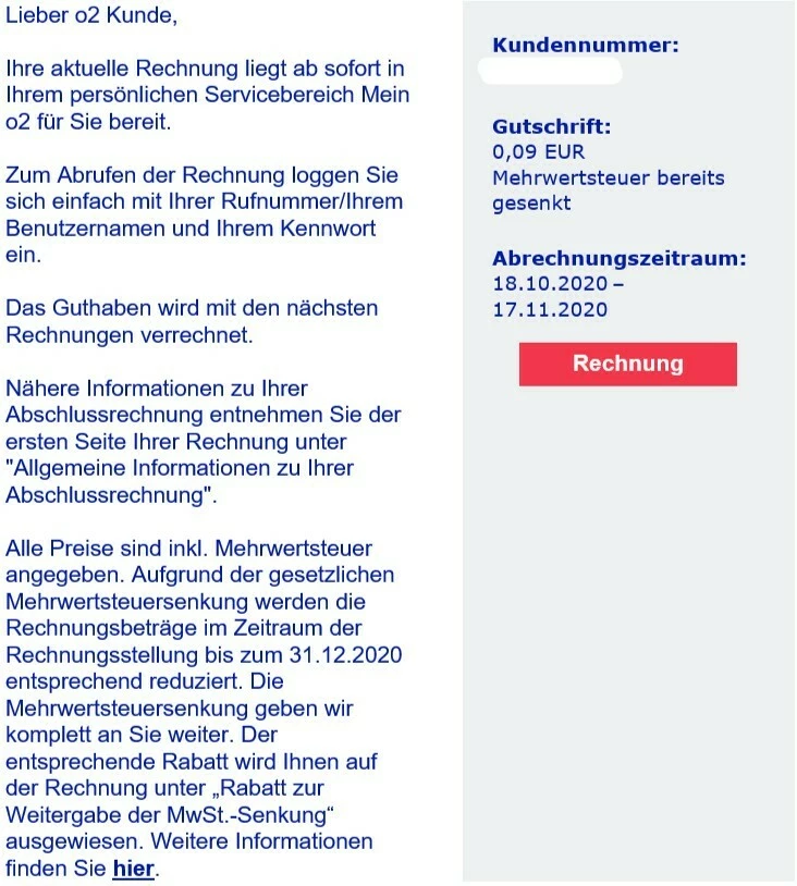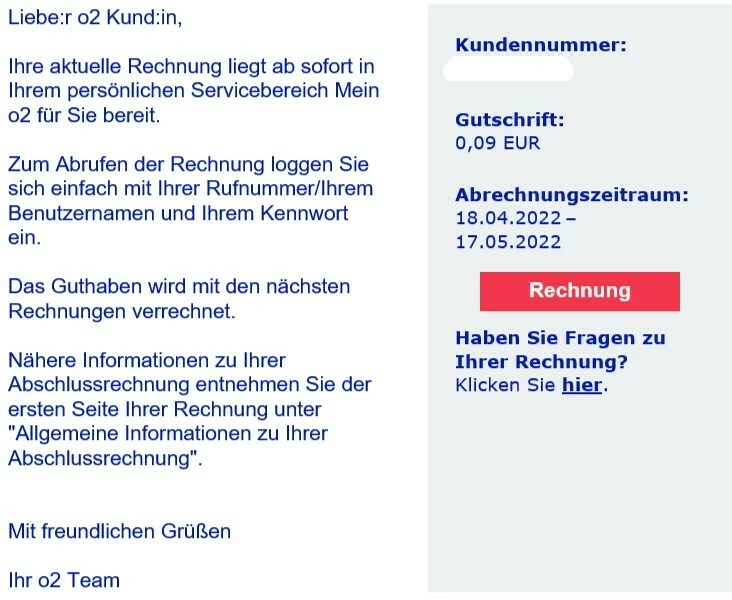 Ich habe daraufhin bei o2-Kundenservice angerufen, um nachzufragen, wieso ich denn noch etwas nachzahlen muss. Mir wurde, glaube ich, damals gesagt, dass es ein Fehler war und ich würde das Geld erstattet bekommen. Da wurde jedoch ein Vorgang ausgelöst, der seitdem mir jeden Monat eine E-Mail bzgl. einer Gutschrift für den aktuellen Rechnungsmonat (0,09€) zuschickt. Da ich, wie gesagt, keine Kundin mehr bin, kann ich nichts mit dieser E-Mail anfangen.