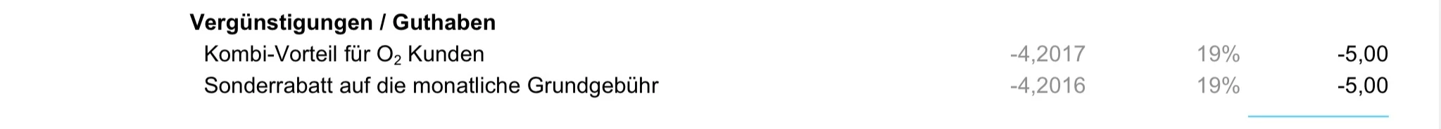 ich hab nochmal nachgesehen: er ist bei Tarifdetails/Preise und Rabatte unter “o2 Discounts” in Mein o2 sichtbar, heißt dort aber auch “Exklusivvorteil”, und da ich dort die korrekte Summe sah, ging ich davon aus, dass er das wohl sein müsste. Er heißt jetzt auch in der aktuellen Rechnung nicht “Kombi-Vorteil”, weshalb ich halt etwas stutzig bin, ob das nun dauerhaft so richtig ist.