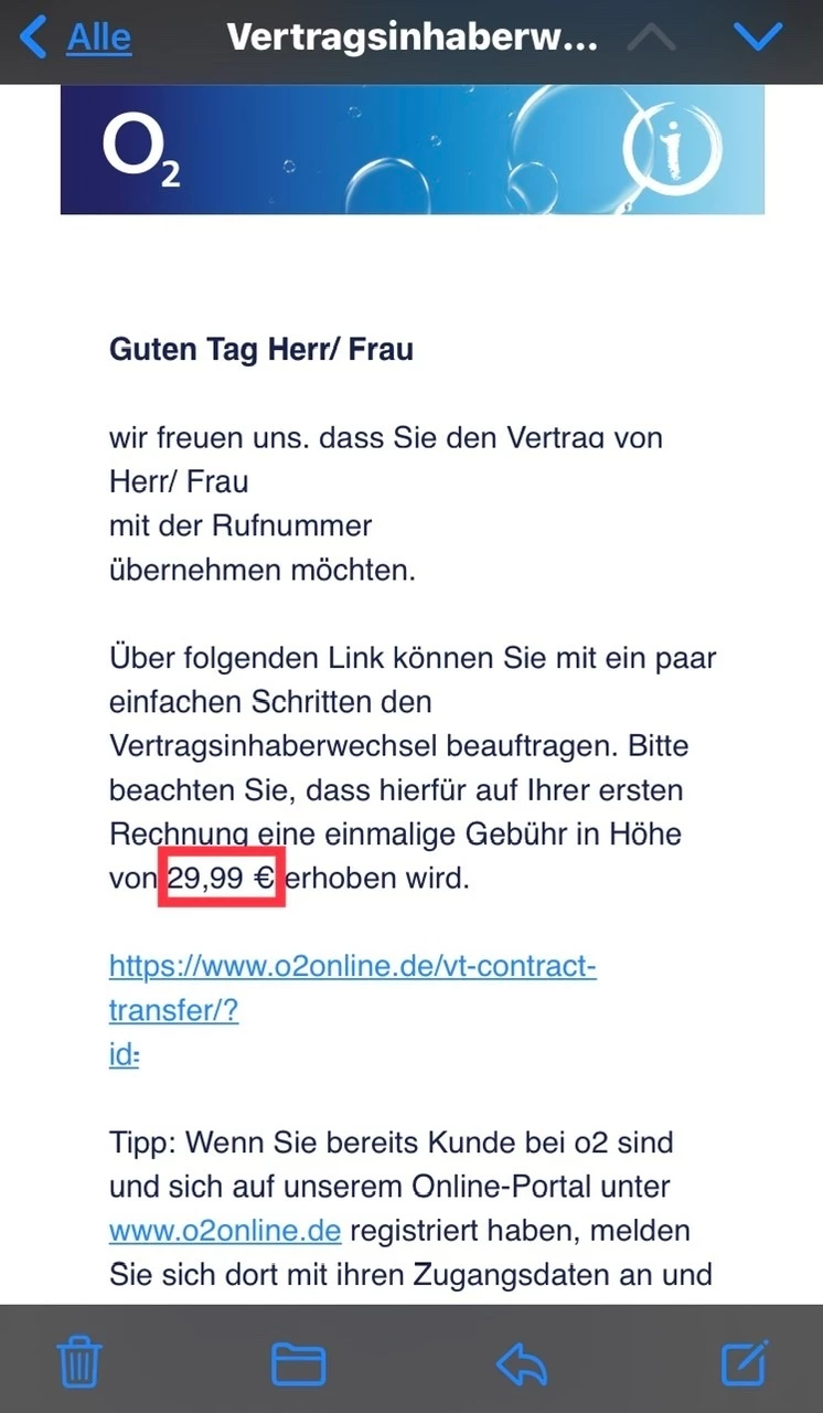 Für den Vertragsinhaberwechsel werden dem neuen Vertragsinhaber 34,99 € in Rechnung gestellt.