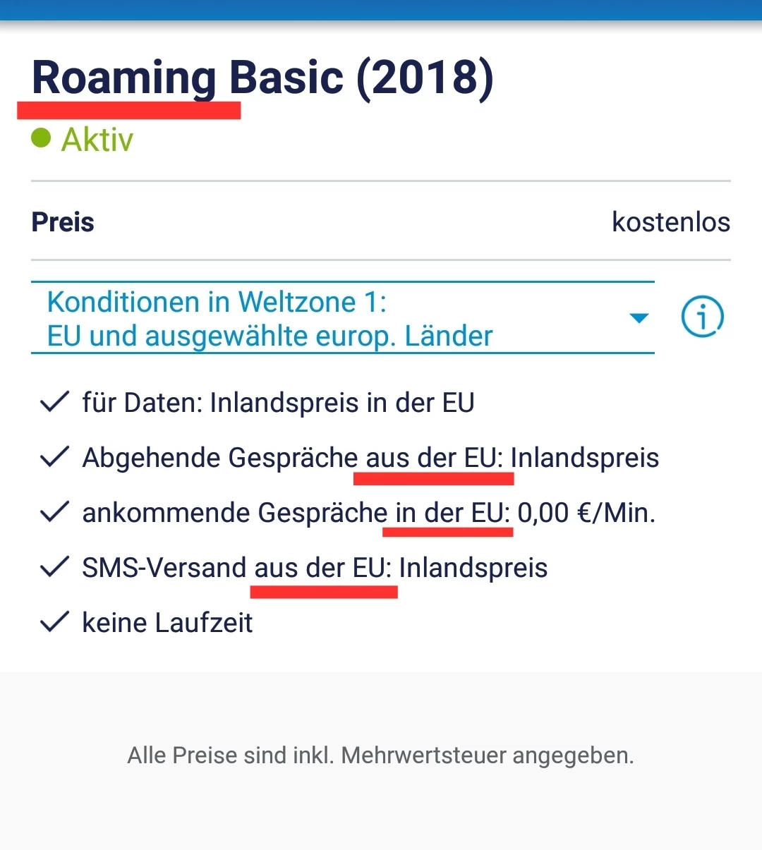 Ich habe Roaming Basic. Abrechnung im EU-Ausland gemäs Inlandstarif.