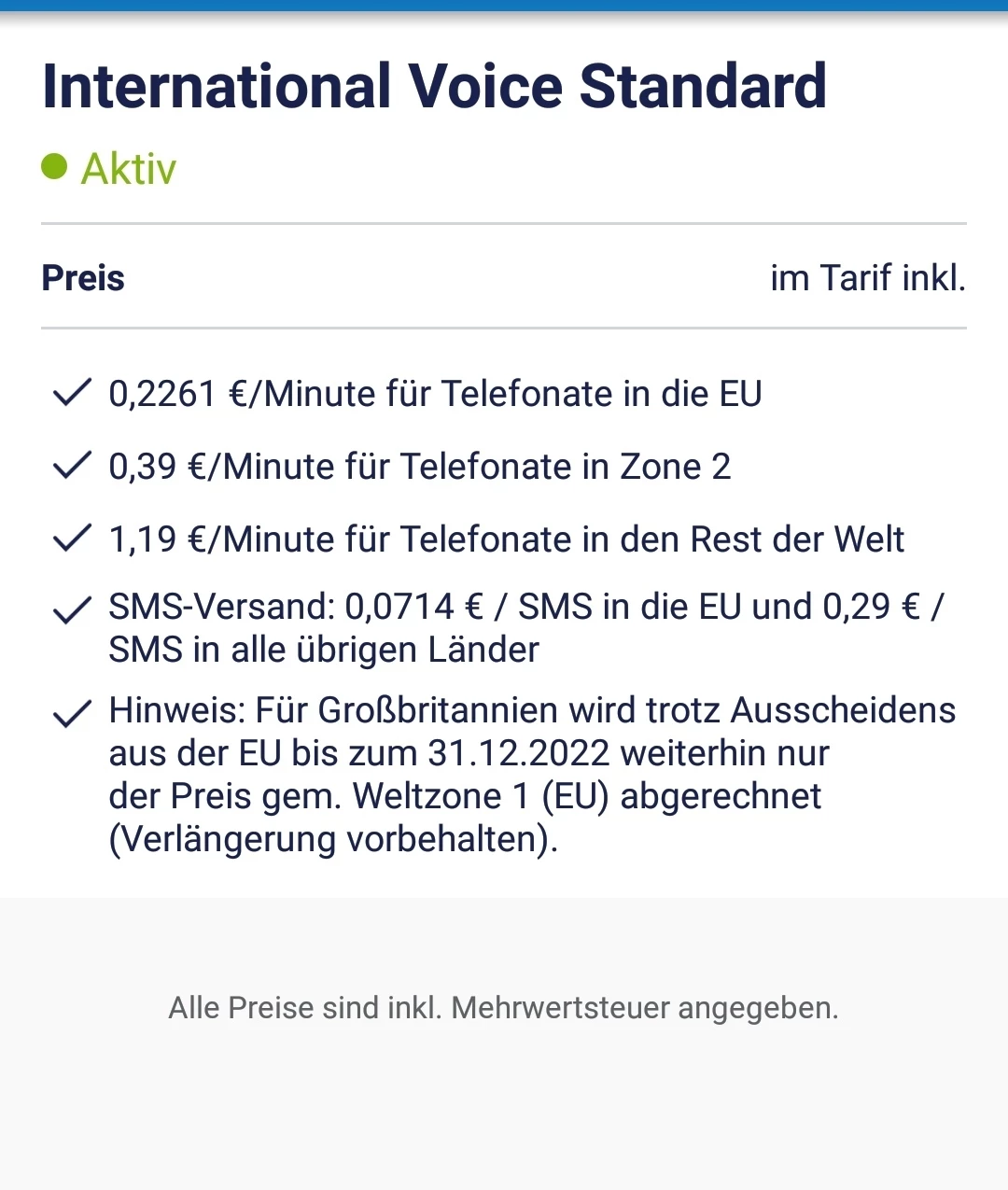 Abgehende Gespräche aus der EU: Inlandspreis; ankommende Gespräche in der EU: kostenlos ; SMS-Versand aus der EU: Inlandspreis; Datennutzung in der EU : Inlandspreis
