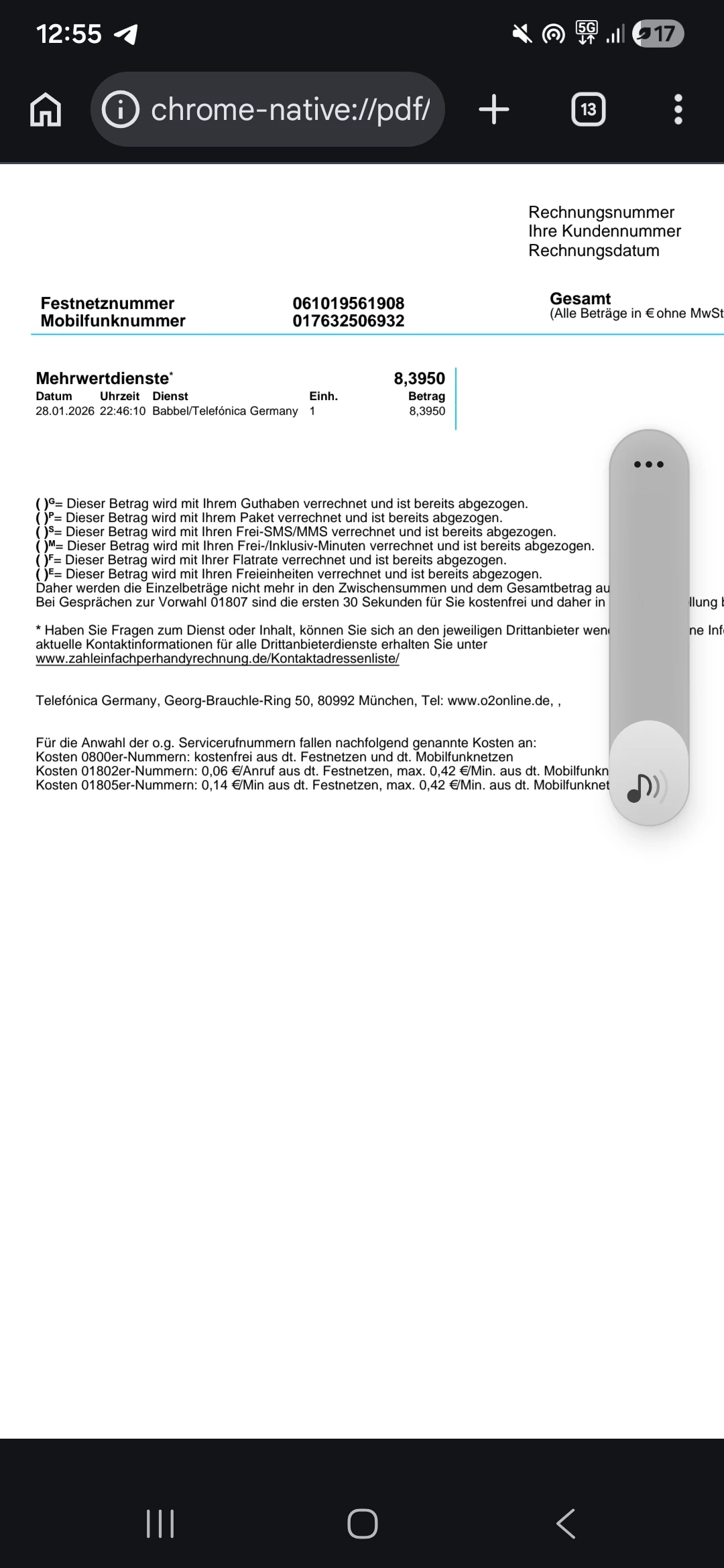 Guten Tag, ich habe in meiner Rechnung vom 25.02.2026 eine Abbuchung über 9,99 € für 'Mehrwertdienste' von 'Babel/Telefónica Germany' am 28.01.2026 um 22:46 gefunden. Ich habe diese Dienstleistung nicht bestellt. Bitte stornieren Sie diese Abbuchung und erstatten Sie mir den Betrag für Januar sowie für die letzten Monate. Ich habe bereits die Drittanbieter-Sperre aktiviert."