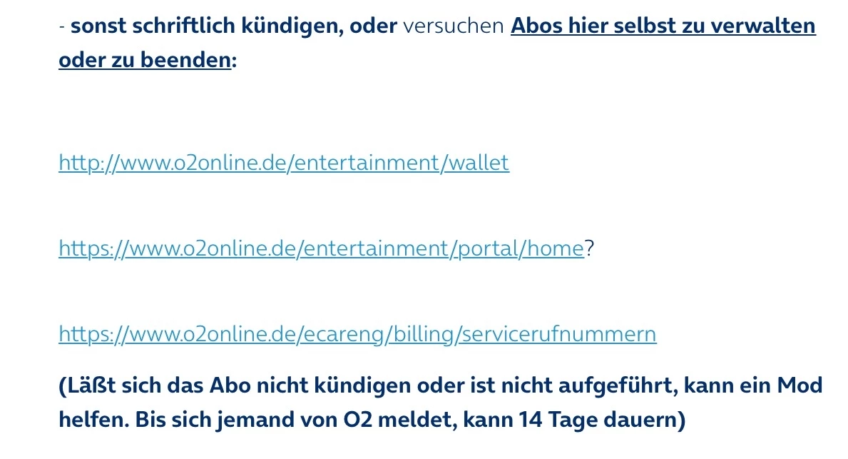 eine Antwort seitens der o2_Moderation kann bis zu 14 Tage dauern. Die Drittanbieter sperrst du in „Mein O₂“ Unter Tarif & SIM-Karte im Reiter SIM-Karte verwalten unter Drittanbieterdienste. Diese gilt für zukünftige Aktivitäten und kündigt kein bestehendes Abo. Lies dir bitte den Link sorgfältig durch.