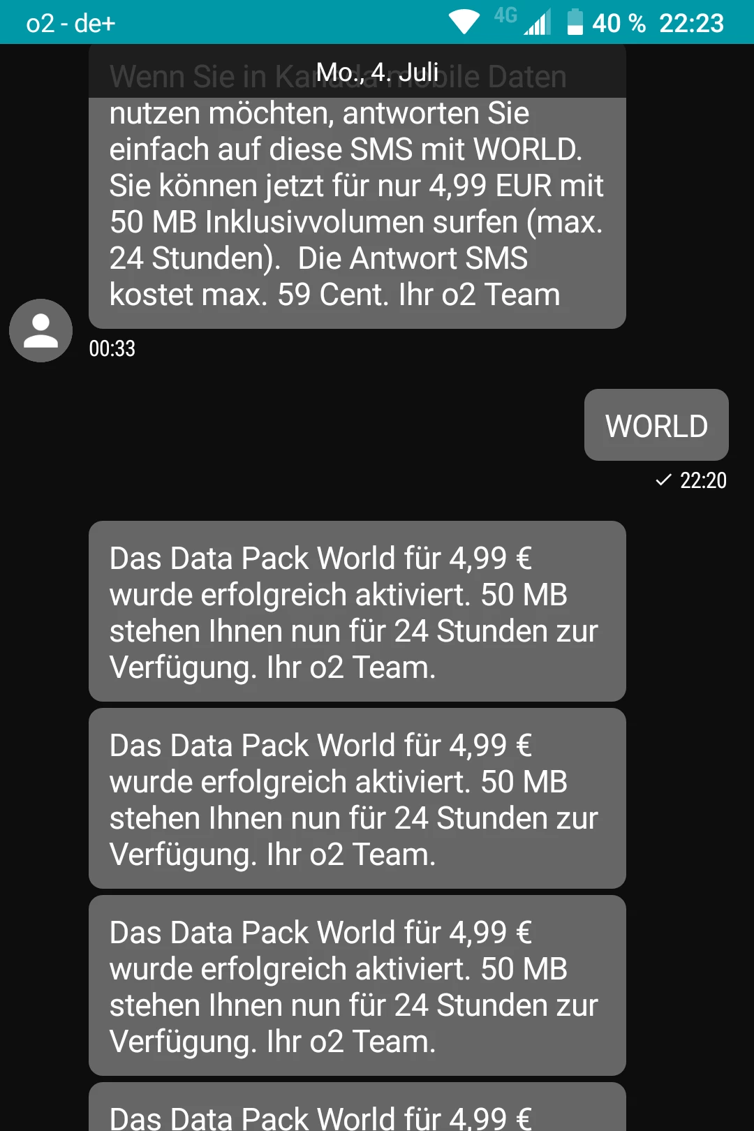 bei einer meiner Auslands-Reisen nach Kanada (04.07.) habe ich mit der Antwort-SMS “WORLD” das von o2 angebotene Datenpaket mit 50 MB für 24 Stunden für 4,99 EUR per SMS aktiviert.