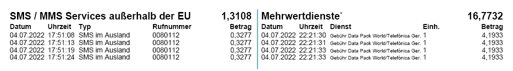 Leider wurden mir nach Absenden der einen SMS, automatisch insgesamt 4 (!) Antwort-SMS mit der entsprechenden Bestätigung zugeschickt. In der Rechnung (Rechnungsdatum 14.07., Leistungszeitraum 10.06.-09.07.) wurden mir auch unter “Verbindungen & Services", “Mehrwertdienste” insgesamt 21,52 EUR berechnet.