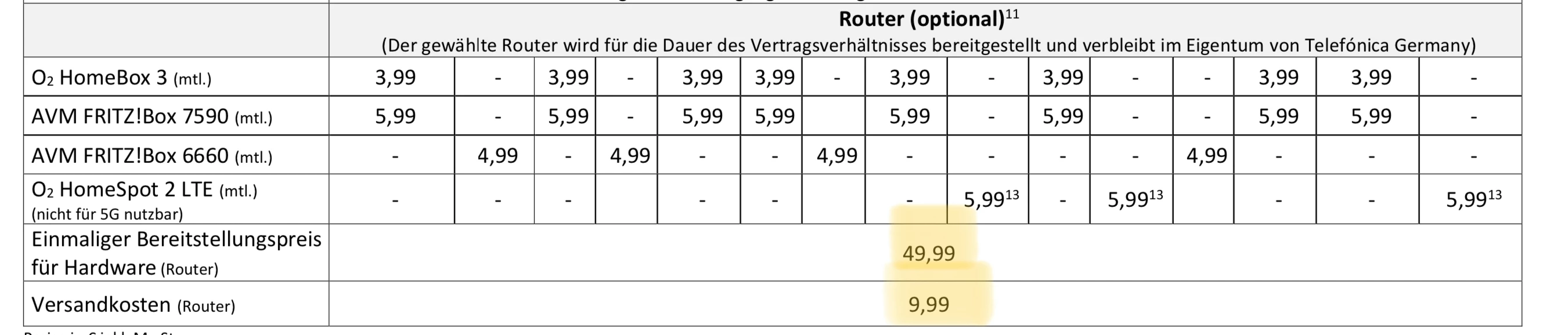 Es wurde alles telefonisch abgewickelt, dadurch habe keinerlei Tabellen oder sonstiges bekommen und deutlich nach sämtlichen Kosten für den Router gefragt. Der Router sollte lediglich 4.99€ Miete im Monat kosten und deutlich besser wie mein alter sein, der nicht mal WLAN durch eine 13 cm starke Innenwand drücken konnte.