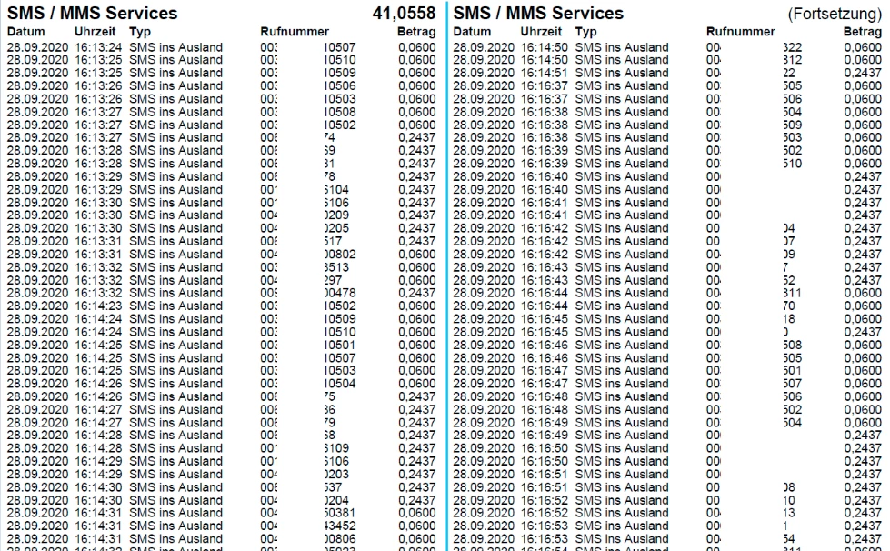 Eine grundsätzliche Info zum SMS Versand: Eine SMS hat 160 Zeichen, bei einer überlangen SMS erscheinen die einzelnen SMS daher im Sekundentakt auf dem Einzelverbindungsnachweis.