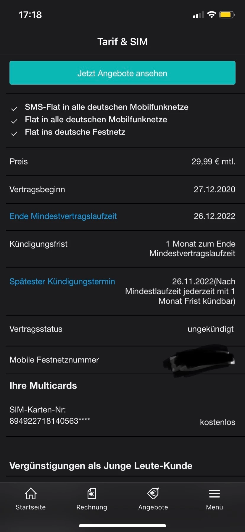 Dabei ist mir aufgefallen, dass ich seit meiner Rechnung vom 18.01.21 (1856176338/06) 5,00 € und seit der Rechnung vom 18.02.21 (1894728912/06) 10,00 € für eine Multicard SIM 2 bezahle. Ich habe bereits mit einem Mitarbeiter über WhatsApp Kontakt gehabt, dieser kann mir eine Rechnungsänderung nur innerhalb der letzten 6 Monate gestatten. Quasi 60 von 155 €, die ich dann bekommen würde … für einen Posten den ich nie hatte und nie genutzt habe.