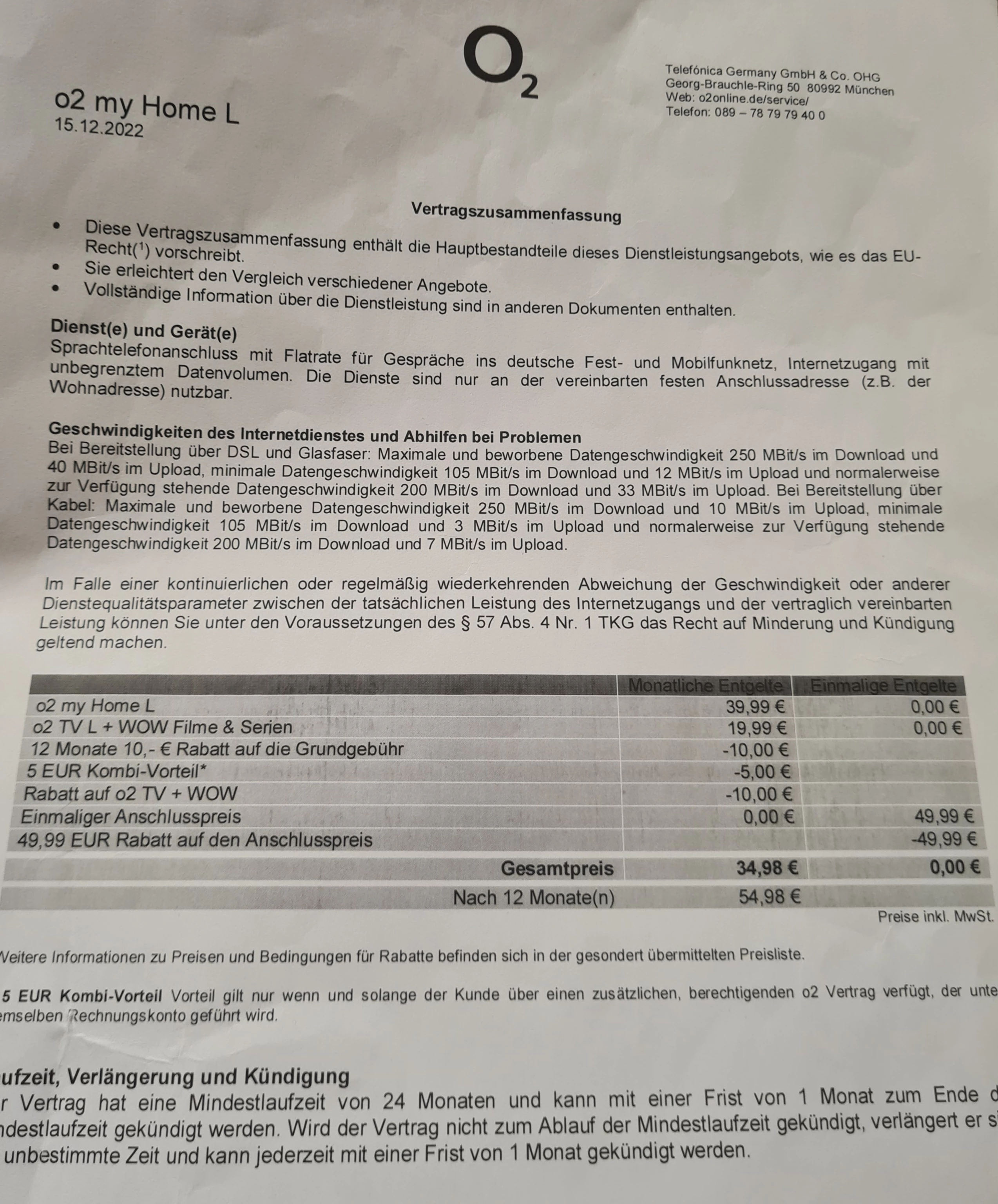 Ich habe im Dezember 2022 einen O2 L Home Vertrag für DSL abgeschlossen,direkt in einem O2 Shop. Anschlussdatum war der 23.01. diesen Jahres. In der Vertragszusammenfassung  wurden 2 Rabatte vereinbart. Zum einen 10 € pro Monat auf die Grundgebühr im 1. Vertragsjahr. Zum anderen 5€ pro Monat Kombirabatt. Der Kombirabatt wurde bisher problemlos berücksichtigt. Der Rabatt auf die Grundgebühr leider bisher durchgehend nicht.