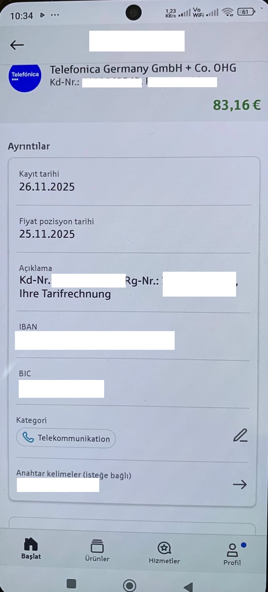 Nimm den Text aus Açıklama und füge den als Açıklama wieder ein. Und trage als Bank Verbindung die selbe iban als Empfänger ein…