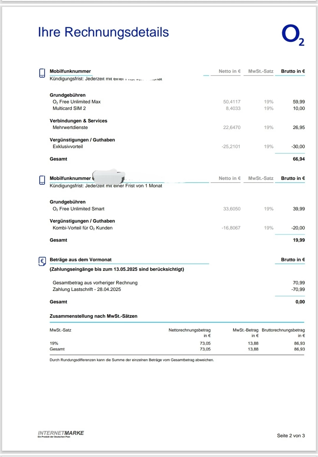in der Rechnung auf Seite 2 steht genau wie sich der Betrag zusammensetzt. Schaue bitte dort nach und berichte dann.