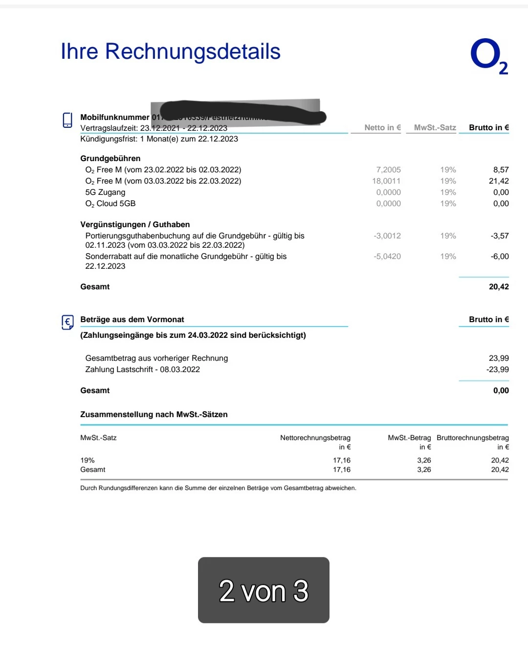 Der Leistungszeitraum deiner Rechnung beginnt am 23.02.22 und endet am 22.03.22. Auf deinem Screenshot der zweiten Rechnungsseite siehst du unter “Vergünstigungen / Guthaben” den Eintrag zum Portierungsguthaben. Hier ist ebenfalls ein Berechnungszeitraum hinterlegt. Dieser läuft vom 03.03.22 bis zum 22.03.22, da die Buchung des Rabatts zu diesem Zeitpunkt begonnen hat. Ab der nächsten Rechnung wird dann der volle Abrechnungszeitraum berücksichtigt und es werden dort 5 Euro aufgeführt sein.
