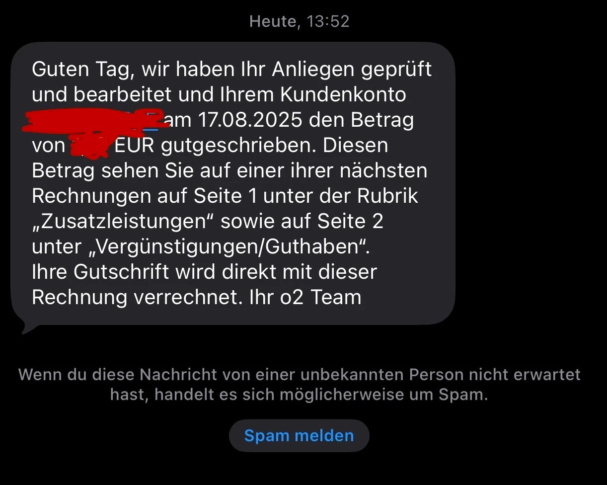 Die auf der aktuellen Rechnung angefallenen Verbindungskosten habe ich dir gutgeschrieben, eine Bestätigung dazu erhältst du in Kürze per E-Mail/SMS.