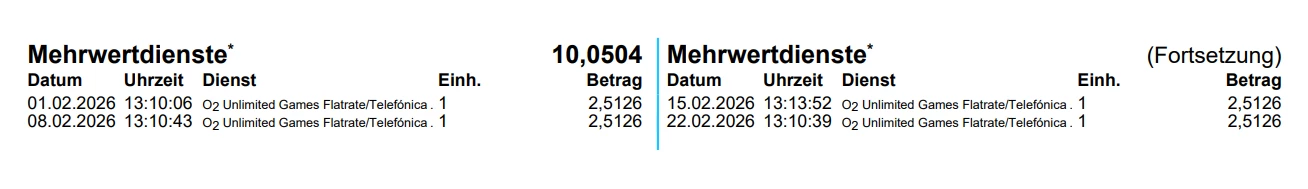 ich nutze die Unlimited SIM nur in einem LTE-Router, nicht in einem Handy o. ä. Nichtsdestotrotz werden auf der aktuellen Rechnung 2 Buchungen im Gesamtwert von rund 11€ zum o. g. Abo ausgewiesen, die ich nicht gebucht habe.