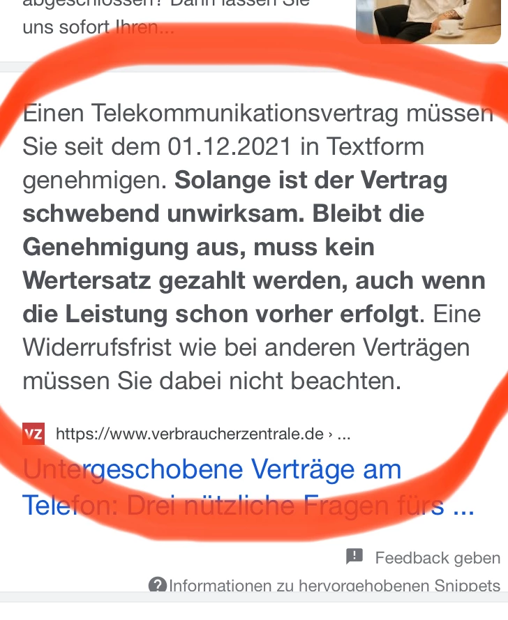 Hey , danke Micha für deine Mühen, das was du da schreibst weiß ich doch alles. Ich bin da ganz bei @Libertas - so sehe ich das auch! Traurig ist das und eine wirklich sehr unangenehme Art der abzocke! Ihr Vorgehen in dieser Sache ist illegal, da es nie zu einem Vertragsabschluss gekommen ist und ich obendrein getäuscht wurde! Enttäuschend nach 20 Jahren als Kunde bei ihnen… ich werde schnellst möglich all meine vorhandenen Verträge mit ihrem unternehme kündigen und prüfen welche Alternativen es für geschäftliche Verbindungen mit ihrem Unternehmen gibt ! den Vorfall werde ich der Bundesnetzagentur melden!