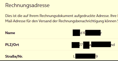 Allerdings steht auf meinen Rechnung immer noch meine alte Anschrift (siehe Anhang bzw. beigefügt Screenshots). Durch die teilweise Schwärzung sollte erkennbar sein, dass diese Adresse eben nicht mit meinen hinterlegten Daten (Kontakt und Rechnungsadresse) übereinstimmt.