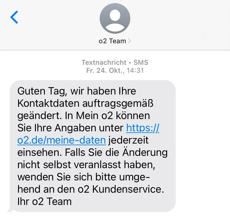 Am 24.10.2025 habe ich zusätzlich eine SMS von o2 erhalten, dass meine Daten erfolgreich aktualisiert wurden (Screenshot im Anhang).