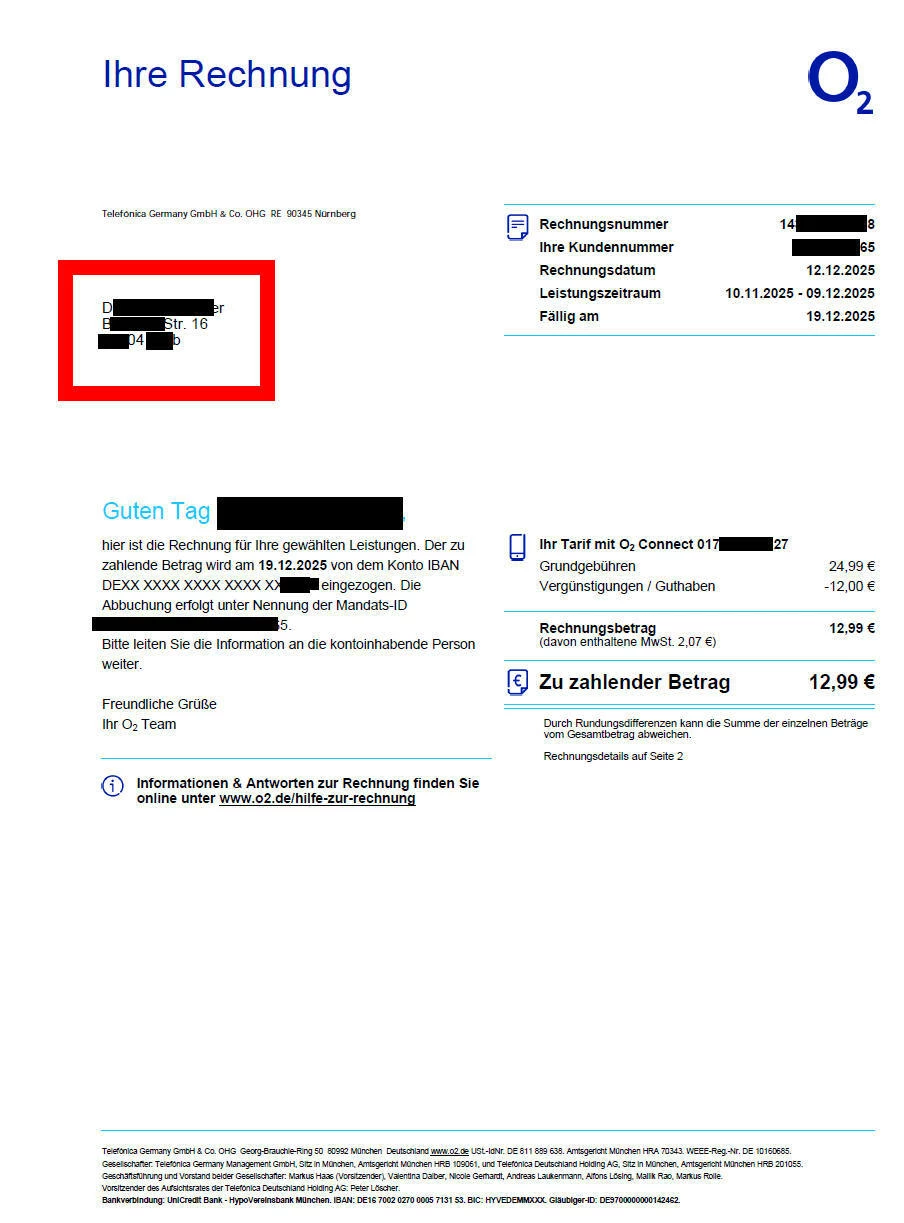 @o2_Bianca Die richtige Adresse war wohl die ganze Zeit im Kundenportal ersichtlich, wurde aber bisher warum auch immer nicht vom Rechnungssystem übernommen. Die von @o2_Giulia bestätigte Änderung wird man also erst nach Ausstellung der nächsten Rechnung nachvollziehen können.