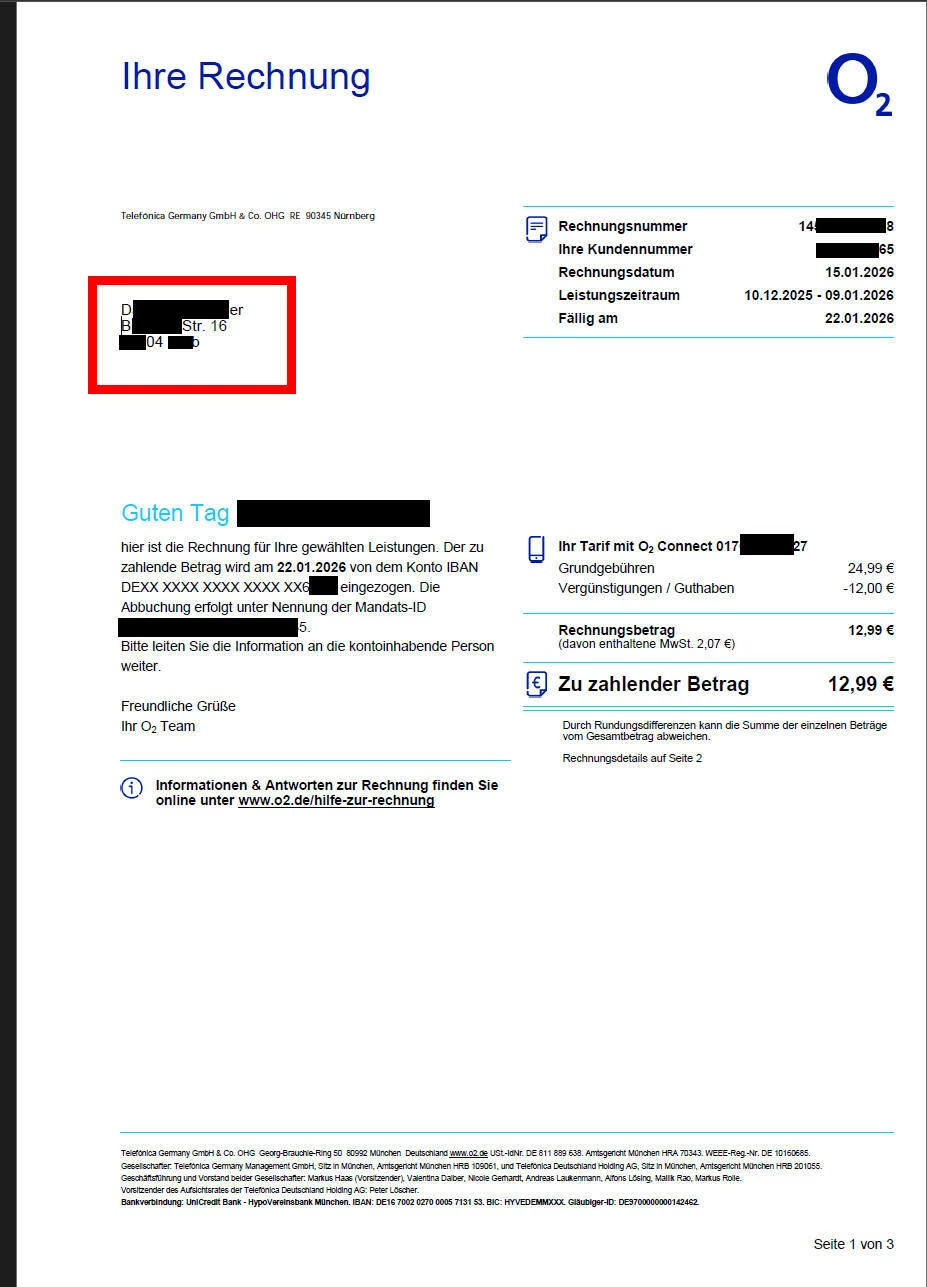 Unsere Mitarbeiter haben heute bereits eine Anpassung der Rechnungsadresse vorgenommen, es sieht nun alles korrekt wie gewünscht aus. Nachvollziehen kannst du es hier: https://www.o2.de/rechnung/adresse