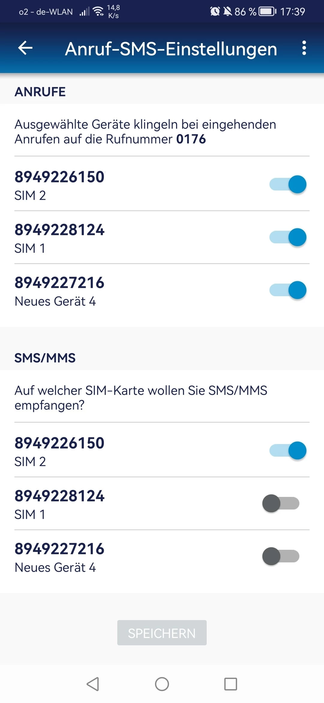 hast du eine Multicard für deinen Vertrag aktiviert und wenn ja, wie hast du die Einstellungen getroffen? Diese kannst du online in “Mein o2” oder auch in der Mein o2 App nachsehen und gegebenenfalls auch ändern. Wähle dazu den betreffenden Vertrag aus, dann SIM verwalten, anschließend wählst du die SIM-Karte aus, die du in dem Gerät nutzt, das du hauptsächlich verwendest, klickst auf “Anruf- und SMS-Einstellungen” und wählst über den Regler aus, welche deiner SIM-Karten die SMS empfangen soll. Bei SMS kann nur eine der SIM-Karten diese empfangen, daher ist es wichtig, dass die richtige Karte ausgewählt ist. So sieht es zum Beispiel in der Mein o2 App aus, wenn die die Multicard-Einstellungen aufrufst
